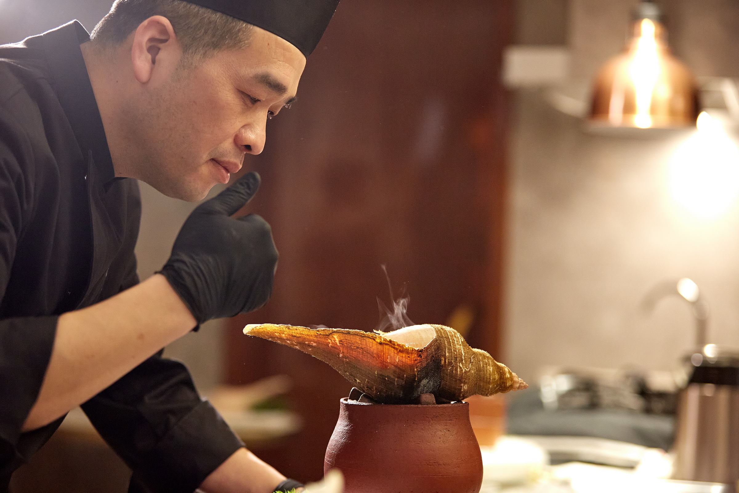 茅台酒炭烧响螺方法考究,烹饪技术要求高,现已列入潮州菜非遗美食,茂府潮宴行政总厨林镇兵遵循传统的烹饪方式,仅凭听声、观色、嗅味来判定螺肉在壳中火候,响螺完成最后一步加上茅台酒风味倍增!观其色,螺肉白嫩细腻,闻其味,焦香浓郁,品其肉,回味无穷。成为宴请最重要的客人的一道美味佳肴!